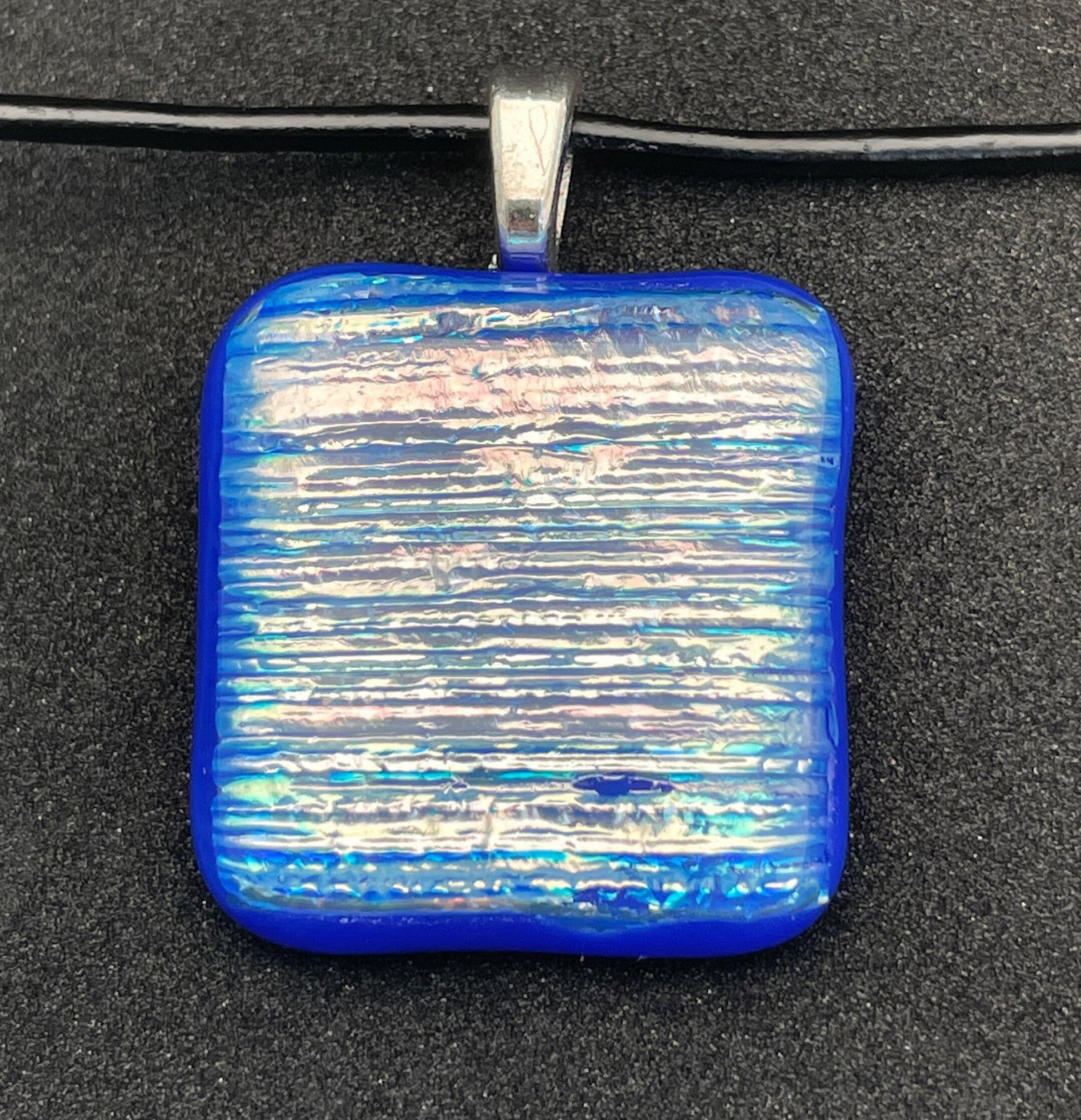 Blue, pink, gold, silver square dichroic glass pendant with leather cord.